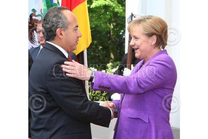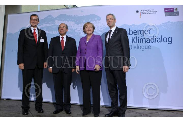 BONN, ALEMANIA, 02MAYO2010.- Juan Rafael Elvira Quesada, secretario del Medio Ambiente y el presidente de México, Felipe Calderón Hinojosa; durante un encuentro bilateral con la canciller de este país, Angela Merkel (acompañada por un colaborador). FOTO: ALFREDO GUERRERO/CUARTOSCURO.COM