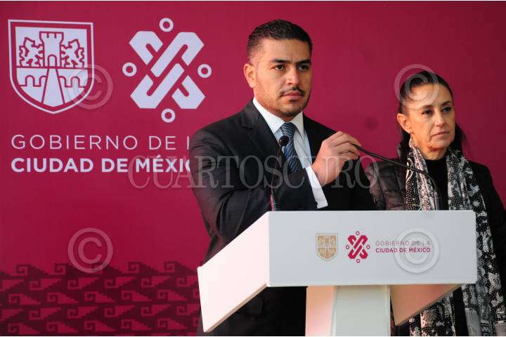 Claudia Sheinbaum, jefa de gobierno de la capital y Martí Batres, secretario de gobierno de la CDMX, dialogan durante el evento de esta mañana.