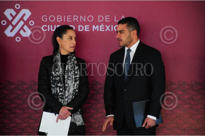 Claudia Sheinbaum, jefa de gobierno de la capital y Omar García Harfuch, titular de la SSC, dialogan durante el evento.