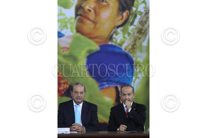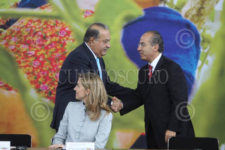 MÉXICO, D.F., 14JUNIO2010.- Carlos Slim Helú, fundador del grupo Carso, saluda a Felipe Calderón Hinojosa, Presidente de México, durante la ceremonia de lanzamiento de la iniciativa Salud Mesoamericana 2015, en el Museo de Antropología. FOTO: MOISÉS PABLO/CUARTOSCURO.COM