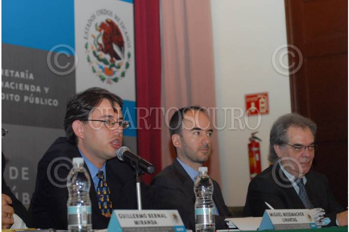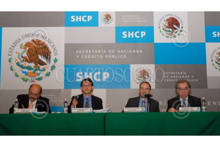 MÈXICO, D.F., 31JULIO2008.- Miguel Messmacher, titular de la unidad de planeación económica, encabezó la conferencia para dar a conocer la situación económica, las finanzas públicas y la deuda pública al segundo trimestre, fue presedido por Guillermo Bernal Miranda, titular de la unidad política presupuestal, Rodrigo Brand de Lara, titular de la unidad de comunicaciòn social e Ivan Manuel Perez, Titular de la política de ingresos. FOTO: FELIPE CASTELLANOS/CUARTOSCURO.COM