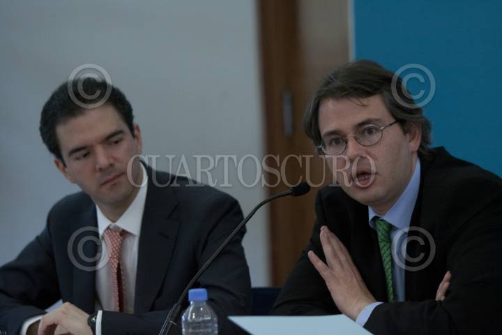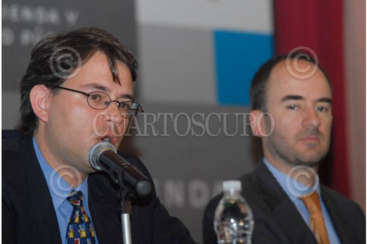 MÈXICO, D.F., 31JULIO2008.- Miguel Messmacher, titular de la unidad de planeación económica, y Rodrigo Brand de Lara, titular de la unidad de comunicación social, durante la conferencia de la Secretaria de Hacienda donde dieron los pormenores en cuanto a la situación económica, las finanzas públicas y la deuda pública al segundo trimestre. FOTO: FELIPE CASTELLANOS/CUARTOSCURO.COM