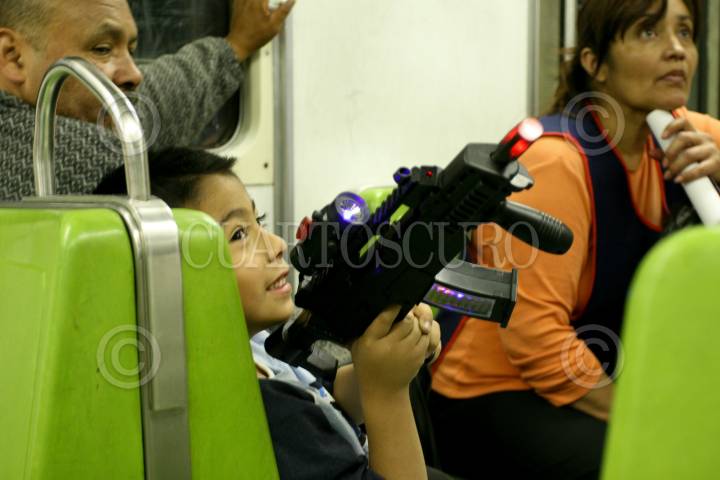 MÉXICO D.F., 24DICIEMBRE2008.- Un niño juega con su metralleta dentro del bagon del metro. Los juguetes bélicos son de los más comercializados en esta temporada de regalos. FOTO: GUILLERMO PEREA/ CUARTOSCURO.COM