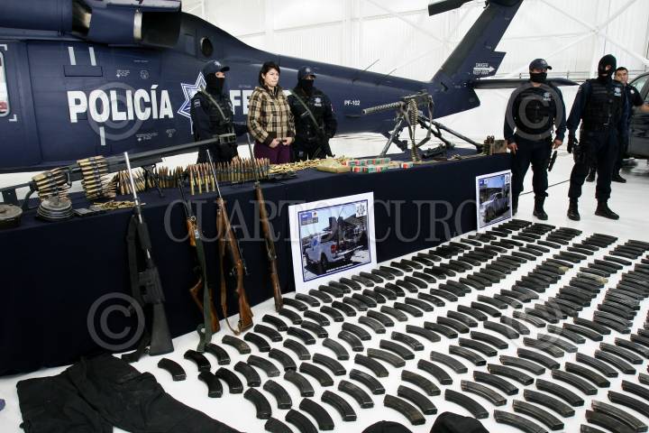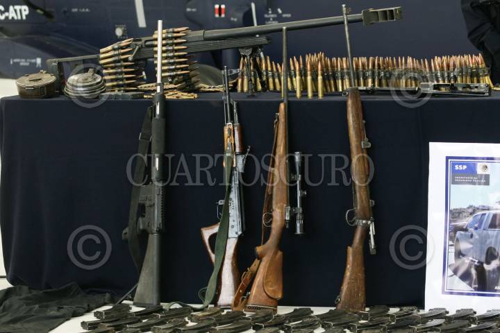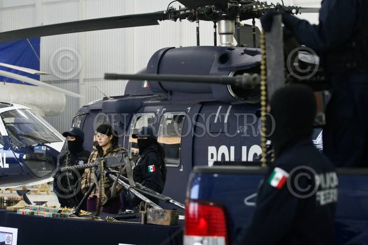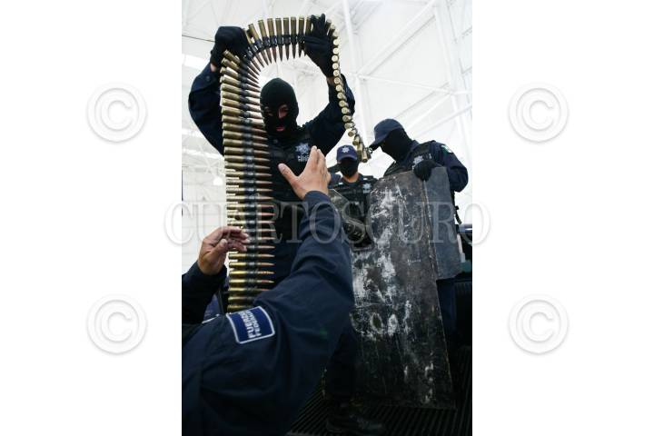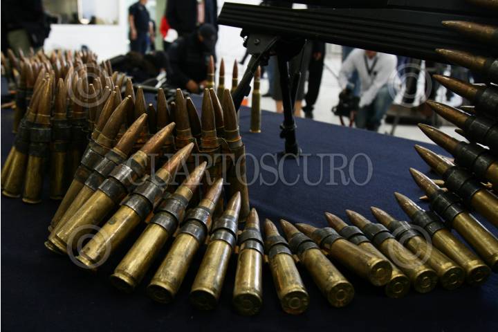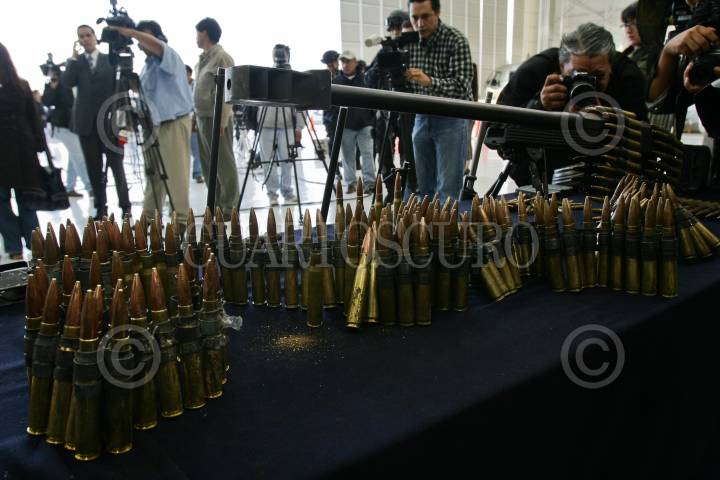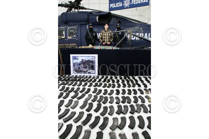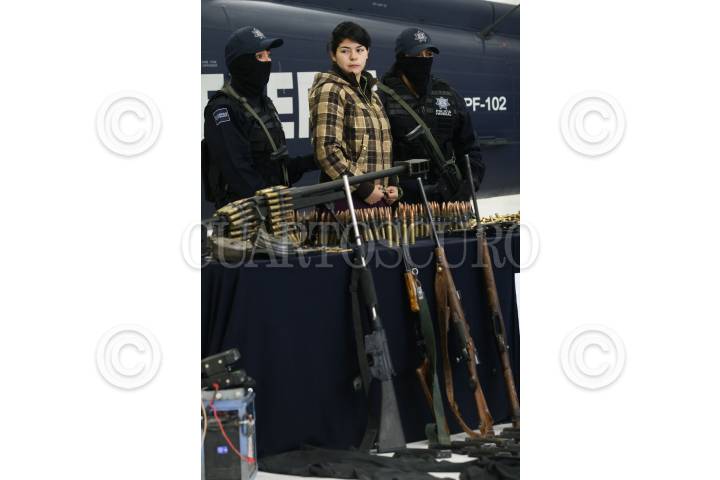 MÉXICO, D.F., 14ABRIL2009.- La Policía Federal presentó en sus instalaciones a Anahí Beltrán Cabrera, de 20 años de edad, quien fue capturada en el municipio de Santa Ana, Sonora, en posesión de un arsenal consistente en una ametralladora marca Browning, calibre 50 milímetros, con capacidad de fuego de 800 disparos por minuto y el suficiente poder para penetrar cualquier tipo de blindaje, además de cinco fusiles, un lanzagranadas, una granada de mano, 261 cargadores, 29 cajas de cartuchos útiles, cuatro cintas metálicas para cartuchos y 750 de gramos de cocaína. La casa donde se aseguró el armamento se encuentra sobre la calle Niños Héroes y avenida Abasolo, colonia Fátima de Santa Ana. FOTO: ISAAC ESQUIVEL/CUARTOSCURO.COM