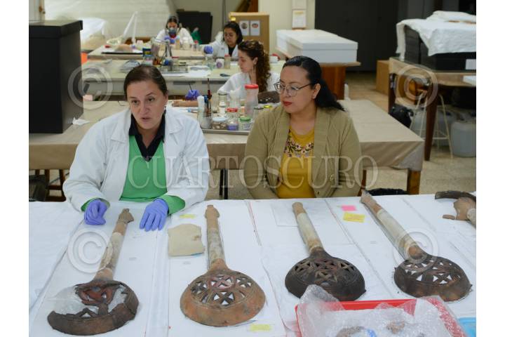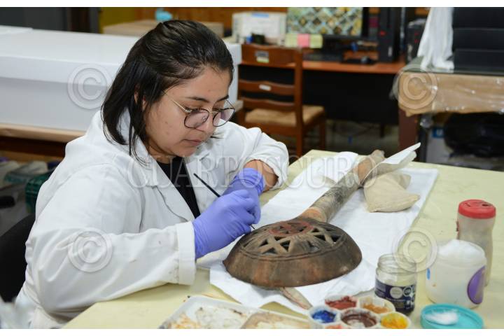 CIUDAD DE MÉXICO, 07OCTUBRE2024.- En un orden que evocaba las trecenas de los 20 signos del tonalpohualli, el calendario ritual mexica, un equipo arqueológico del Instituto Nacional de Antropología e Historia (INAH) encontró, en 2021, una excepcional ofrenda de 13 sahumadores en un predio próximo a la Plaza Garibaldi, en el Centro Histórico de la Ciudad de México, los cuales son restaurados en por profesionales de esta institución de la Secretaría de Cultura federal. En el Laboratorio de Bienes Muebles Arqueológicos, de la Coordinación Nacional de Conservación del Patrimonio Cultural (CNCPC), se atiende este conjunto cerámico, el cual colocó una familia mexica como parte de un ritual de clausura, en algún momento del periodo del contacto español, entre 1521 y 1620 d.C. FOTO: INAH /CUARTOSCURO.COM