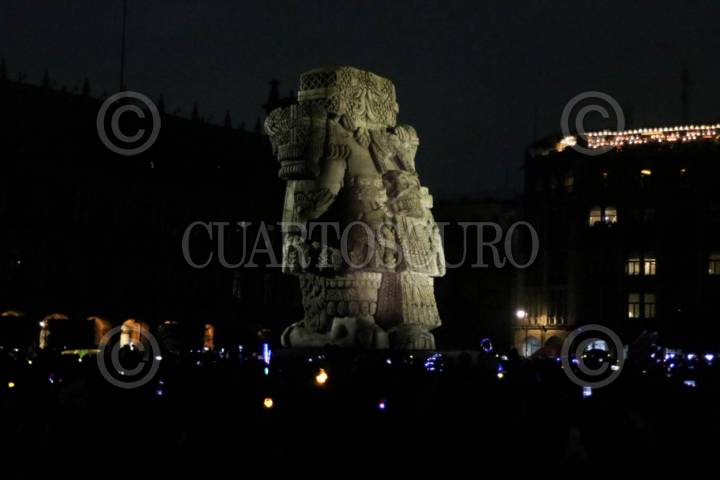CIUDAD DE MÉXICO, 27JULIO2025.- En el marco de la fundación de los 700 años de México-Tenochtitlán, se realizó el último videomaping "Memoria Luminosa", que cuenta la historia de la ciudad con proyecciones en esculturas mexicas monumentales en el Zócalo capitalino. FOTO: GRACIELA LÓPEZ/CUARTOSCURO.COM