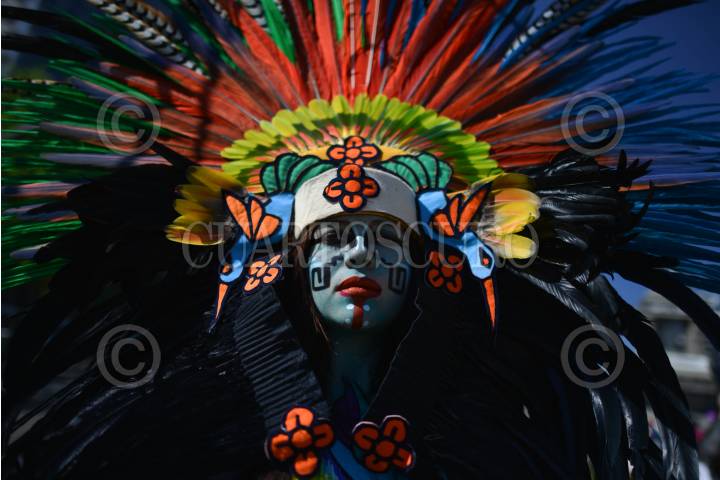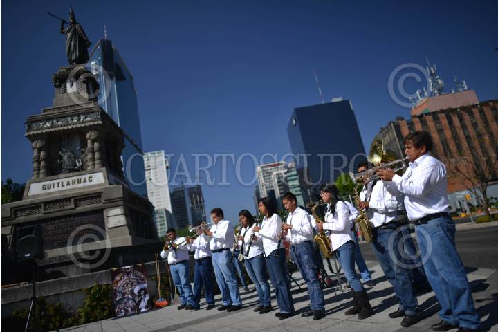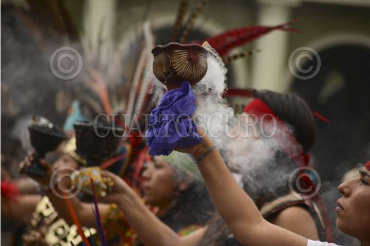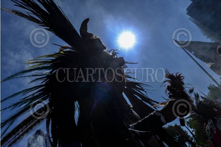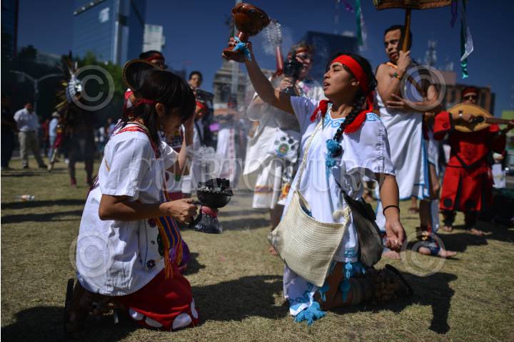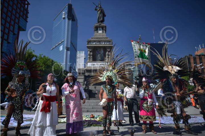 MÉXICO, D.F., 28FEBRERO2015.- Grupos de danzantes prehispanicos, se congregaron en el monumento a Cuauhtémoc, en Paseo de la Reforma, para realizar una ceremonia recordando la muerte del último Tlatuani mexica del Mexico-Tenochtitlan. "El águila que desciende" en náhuatl, asumió el poder en 1520, un año antes de la toma por Hernán Cortés. A partir del siglo XIX su figura fue usada con fines nacionalistas, teniendo máximo símbolo la inauguración del Monumento a Cuauhtémoc, obra de Miguel Noreña, durante la dictadura porfirista. Los participantes, resaltaron el legado de resistencia del líder militar mexica hasta el último día de su muerte. FOTO: ADOLFO VLADIMIR /CUARTOSCURO.COM