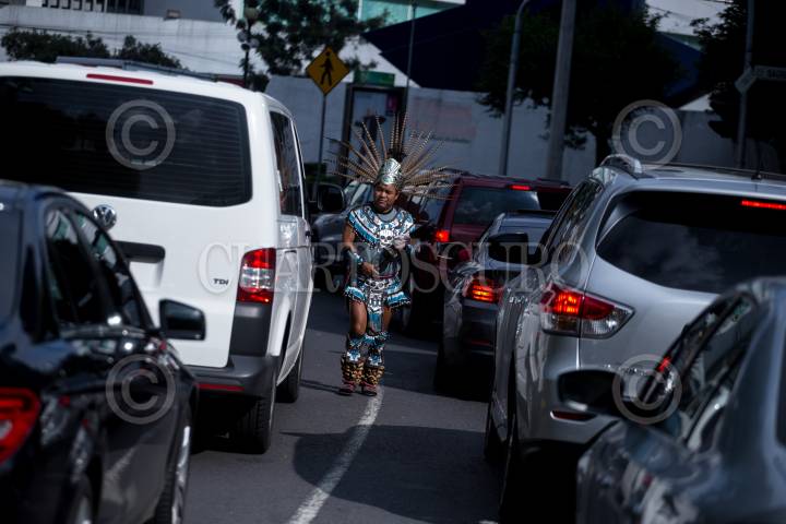 CIUDAD DE MÉXICO, 09AGOSTO2018.- Un "mexica" baila y pide unas monedas sobre avenida Barranco del Muerto al sur de la ciudad. FOTO: ADOLFO VLADIMIR /CUARTOSCURO.COM