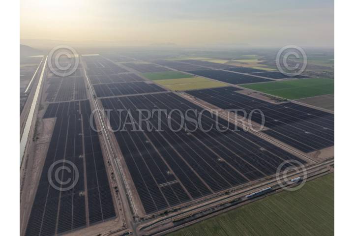 MEXICALI, BAJA CALIFORNIA, 29MARZO2025.- Vista aérea de los paneles fotovoltaicos que forman parte del programa federal "Sol del norte" FOTO: PRESIDENCIA/CUARTOSCURO.COM