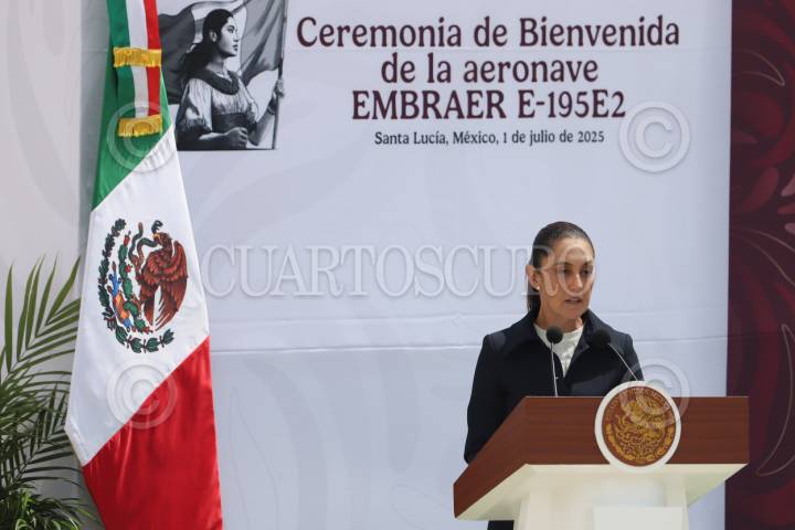 ZUMPANGO, EDOMEX, 01JULIO2025.- Claudia Sheinbaum, presidenta de México, participación en la ceremonia de bienvenida de la aeronave EMBRAER E-195E2, la cual formará parte de la flotilla de aviones de Mexicana de Aviación. FOTO: DANIEL AUGUSTO/ CUARTOSCURO.COM