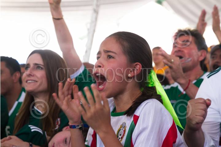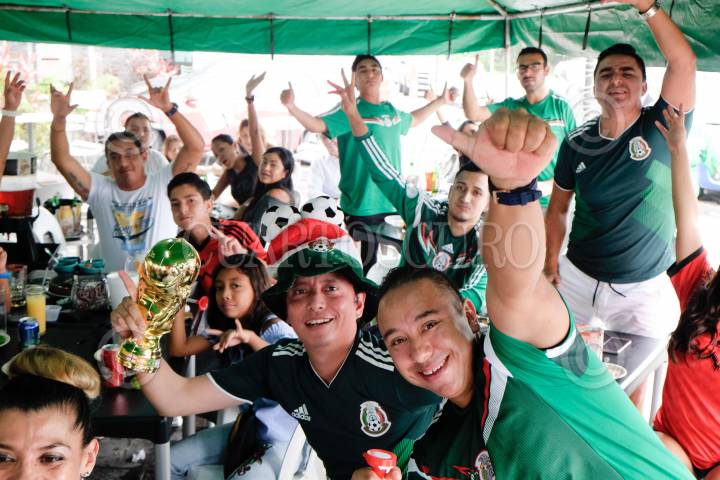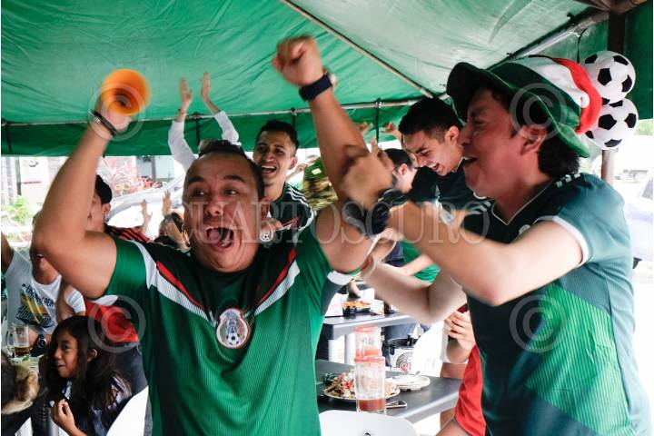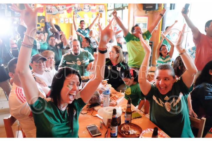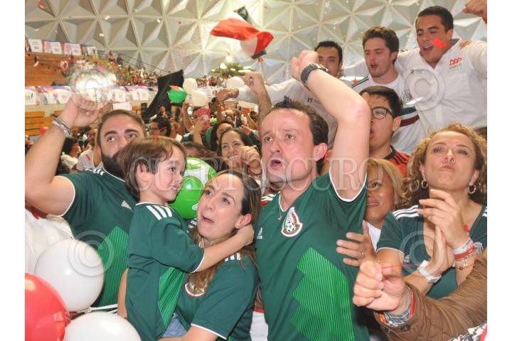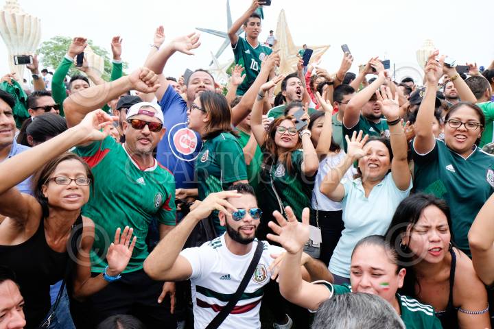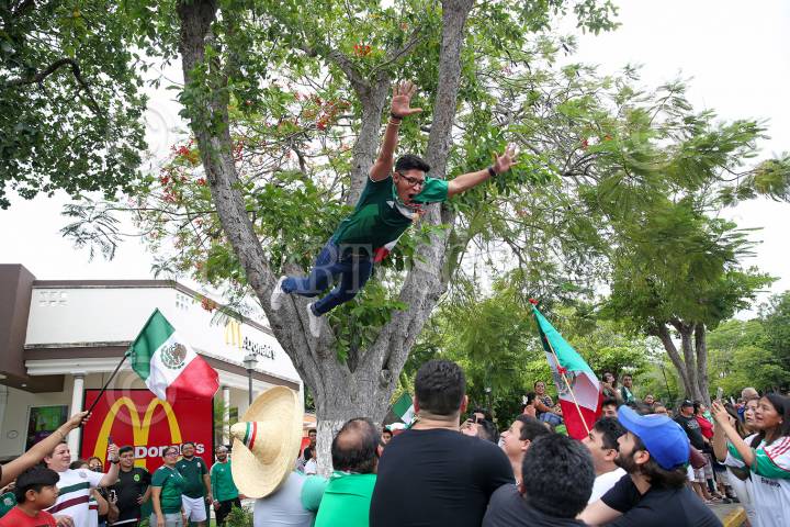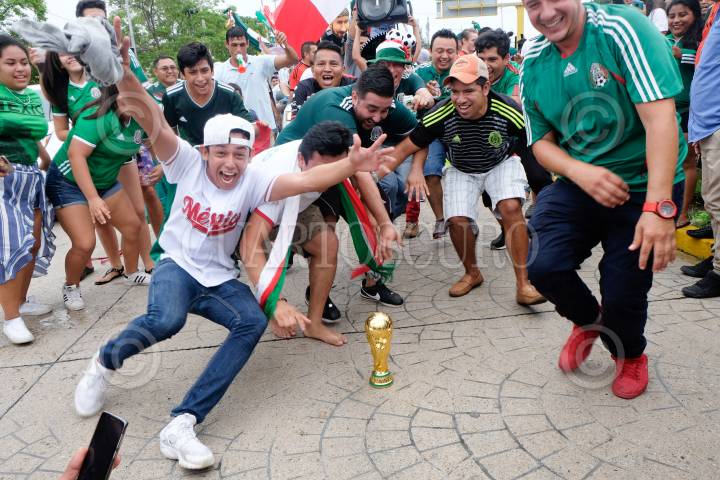 CANCÚN , QUINTANA ROO, 17JUNIO2018.- La afición mexicana se reunió en restaurantes y plazas públicas para observar el partido México vs Alemania de la Copa del Mundo Rusia 2018, en el cual los tricolores se alzaron con la victoria 1-0, con gol del "Chucky" Lozano. Tras el pitazo final los aficionados estallaron en jubilo ya que con esta victoria el seleccionado nacional suma sus primeros tres puntos en la justa mundialista, además de conseguir un resultado histórico ya que jamás se le había ganado a los teutones. FOTO: ELIZABETH RUIZ /CUARTOSCURO.COM