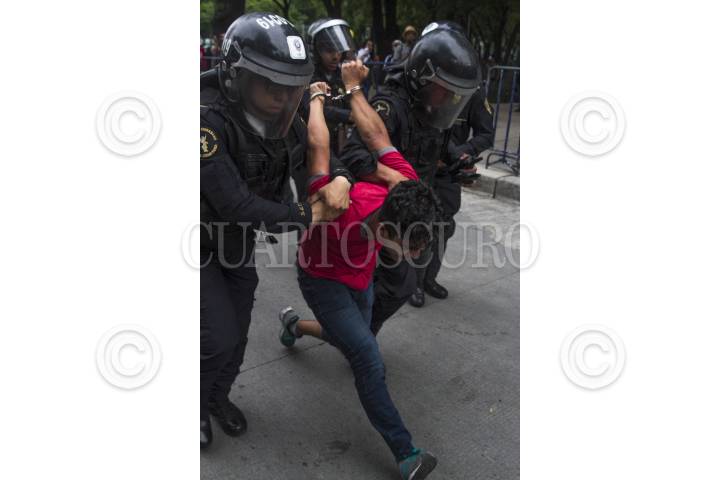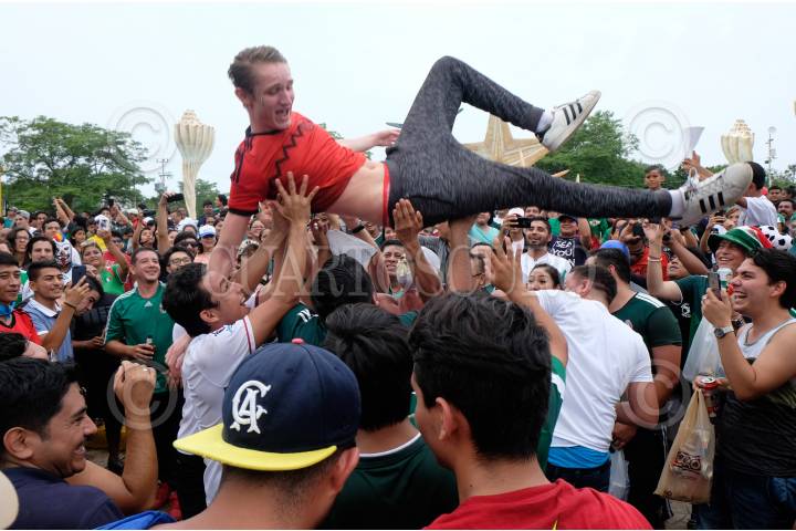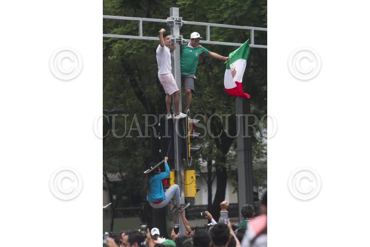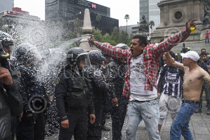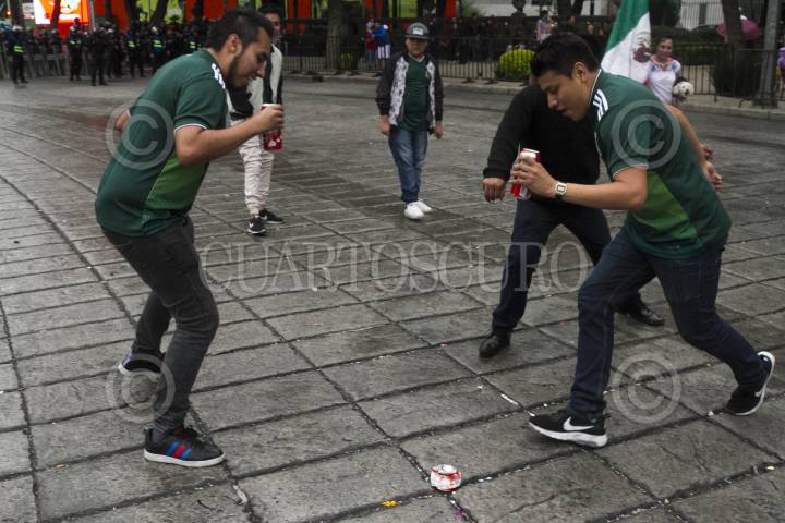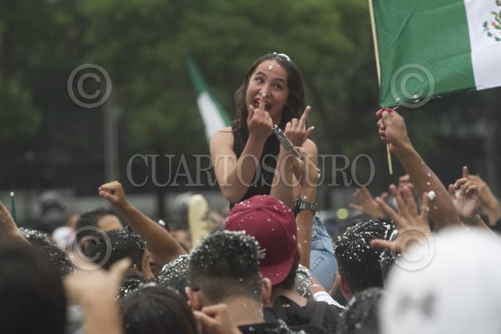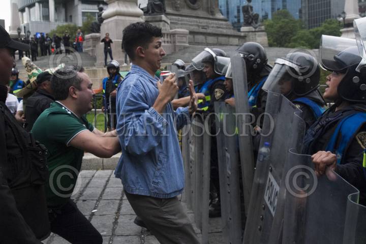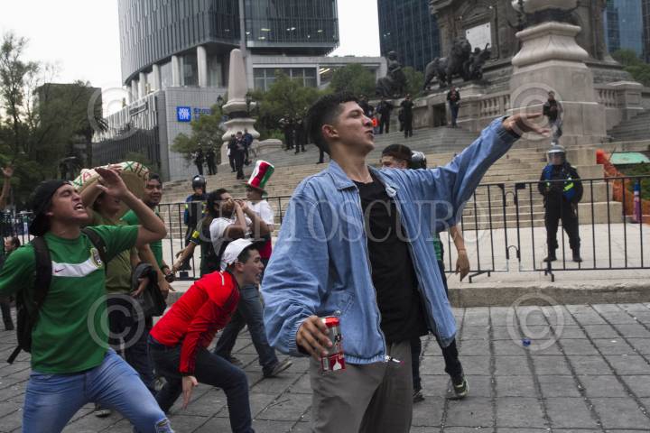 CIUDAD DE MÉXICO, 17JUNIO2018.- Tras la victoria de 1-0 de México sobre Alemania en la fase inicial de la Copa del Mundo Rusia 2018 la afición mexicana se congregó en las inmediaciones del Ángel de la Independencia, y tras varias horas de festejo con la combinación de bebidas embriagantes se presentaron algunos roces de los asistentes con la policía que resguardaba la zona, sin embargo, el festejo se llevo sin incidentes mayores. FOTO: MOISÉS PABLO /CUARTOSCURO.COM