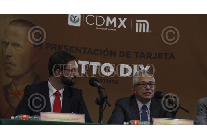 CIUDAD DE MÉXICO, 13ENERO2017.- Jarek Nikolaus Kurczyaski, consejero de cultura del año dual Alemania - México 2016-2017 y Jorge Gaviño, director del Sistema Colectivo Metro (STC), presentaron la tarjeta conmemorativa del transporte público sobre el artista alemán Otto Dix, el tiraje será de 5, 000 ejemplares. FOTO: ANTONIO CRUZ /CUARTOSCURO.COM