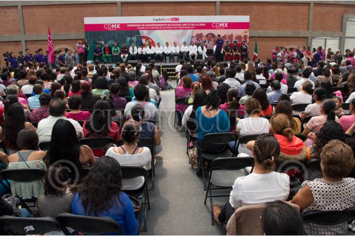 CIUDAD DE MÉXICO, 18MAYO2017.- José Ramón Amieva Gálvez, director de la secretaria de Desarrollo Social de la Ciudad, abanderó a deportistas de la comunidad lésbico gay, bisexual, travesti, transexual, transgénero e intersexuales (LGBTTTI) que viajaran en los próximos días para competir en la 4ta. edición de los World Out Games 2017 en Miami. FOTO: SELENE PACHECO /CUARTOSCURO.COM
