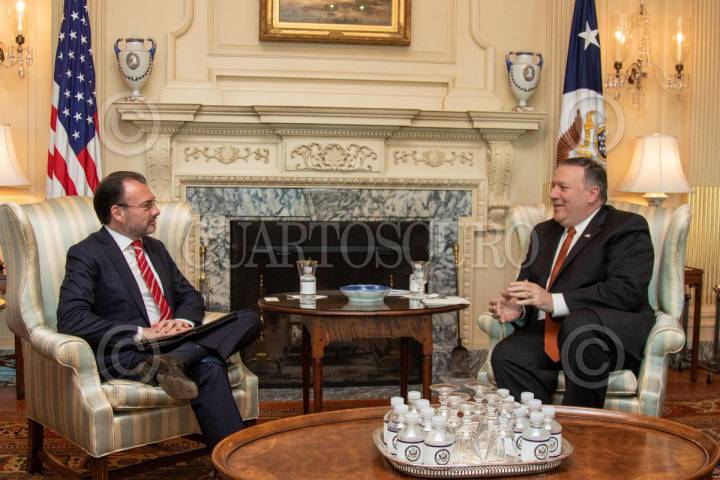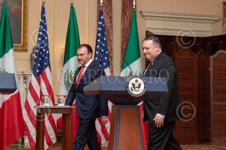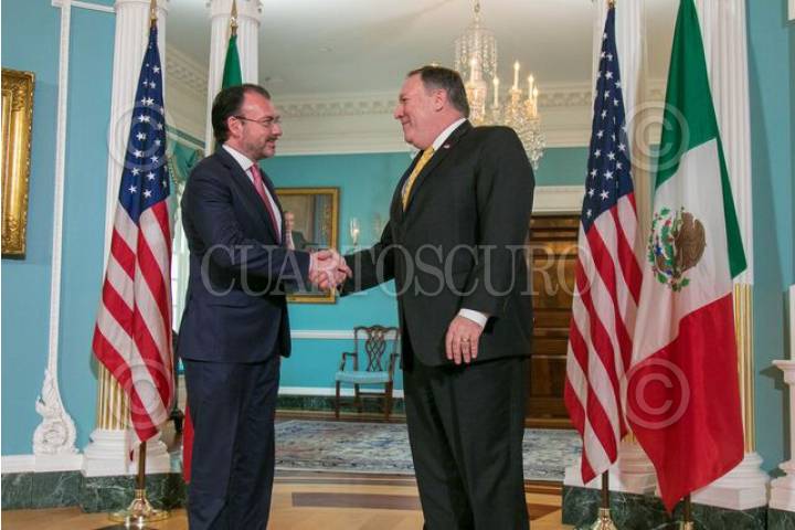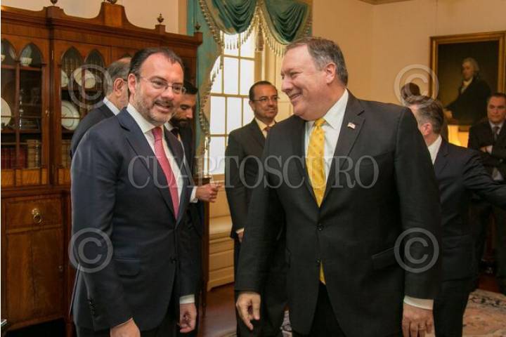 WASHINGTON, D.C., ESTADO UNIDOS, 06MAYO2018.- El día de hoy, el Secretario de Relaciones Exteriores, Luis Videgaray, sostuvo una reunión con el Secretario de Estado de Estados Unidos, Michael Pompeo, en Washington, D.C., para dar seguimiento a temas de la relación bilateral. Durante el encuentro, los Secretarios discutieron la agenda compartida en migración, seguridad y comercio, así como temas regionales sobre Centroamérica y la situación en Venezuela. Al término de la reunión, el Secretario Videgaray destacó que México mantendrá una visión constructiva y abierta que permita superar diferencias, enfrentar retos comunes y alcanzar acuerdos, salvaguardando en todo momento el interés nacional, la soberanía y la dignidad de los mexicanos. FOTO: SRE /CUARTOSCURO.COM