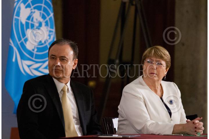 CIUDAD DE MÉXICO, 09ABRIL2019.- Alfonso Durazo, secretario de Seguridad y Protección Ciudadana, y Michelle Bachelet, alta comisionada para los Derechos Humanos de las Naciones Unidas, durante la firma de acuerdo para la prevalencia de los Derechos Humanos en la creación y actuar de la Guardia Nacional. FOTO: GALO CAÑAS /CUARTOSCURO.COM