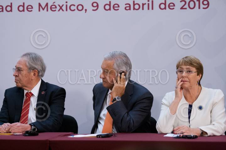 CIUDAD DE MÉXICO, 09ABRIL2019.- Jorge Alcocer, secretario de Salud, Andrés Manuel López Obrador, presidente de México, y Michelle Bachelet, alta comisionada para los Derechos Humanos de las Naciones Unidas, durante la presentación del Informe de la Comisión de Alto Nivel “Salud Universal en el siglo XXI: 40 años de Alma-Ata”. FOTO: GALO CAÑAS /CUARTOSCURO.COM