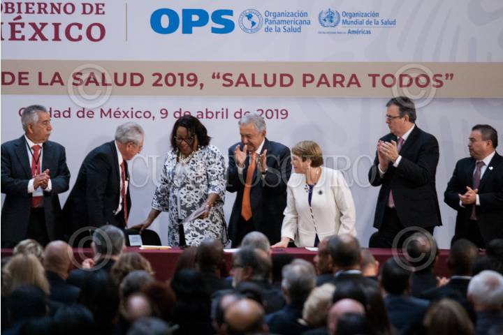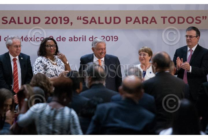 CIUDAD DE MÉXICO, 09ABRIL2019.- Jorge Alcocer, secretario de Salud; Carissa Etienne, directora de la Organización Panamericana de la Salud (OPS); Andrés Manuel López Obrador, presidente de México; Michelle Bachelet, alta comisionada para los Derechos Humanos de las Naciones Unidas, y Marcelo Ebrard, secretario de Relaciones Exteriores, encabezaron la presentación del Informe de la Comisión de Alto Nivel “Salud Universal en el siglo XXI: 40 años de Alma-Ata”. FOTO: GALO CAÑAS /CUARTOSCURO.COM