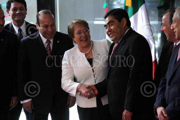 MÉXICO, D.F., 13AGOSTO2015.- Michellet Bachelet, presidenta de Chile, fue testigo de la firma del acuerdo "Fondo cooperación México Chile" entre José Antonio Meade Kuribreña, secretario de Relaciones Exteriores y Heraldo Muñoz Valenzuela, ministro de Relaciones Exteriores de Chile, realizada en el salón José María Morelos y Pavón de la Secretaría. En el evento, se entregaron reconocimiento a Gonzalo Martínez Corbalá, ex embajador de México en Chile en 1973, durante el asilo a cientos de chilenos en el inicio de la dictadura militar. FOTO: CUARTOSCURO.COM