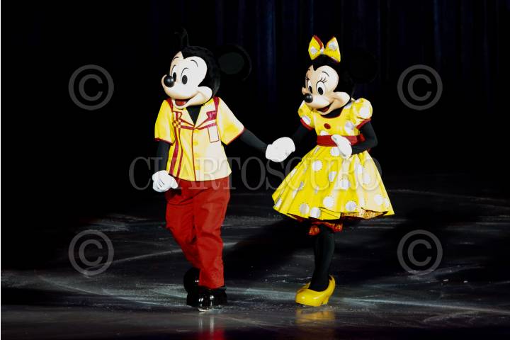 Los personajes Mickey Mouse y Minnie Mouse durante la conferencia del espectáculo “Disney 100 en concierto” en el Lunario del Auditorio Nacional.