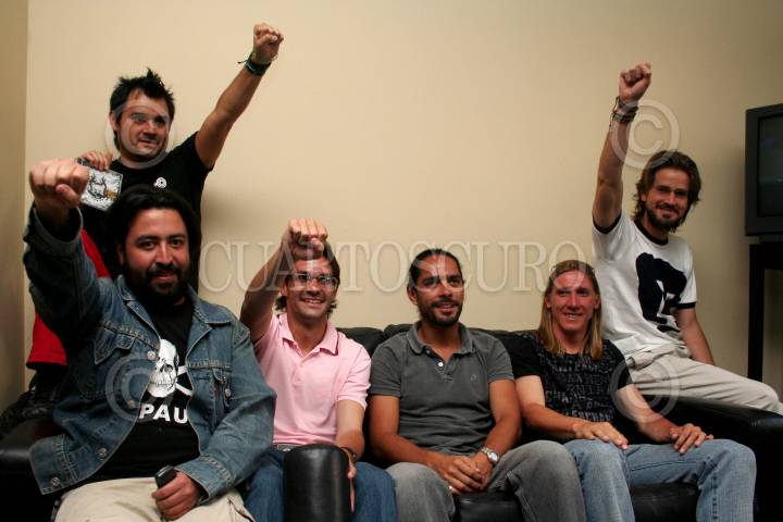 MÉXICO, D.F., 28FEBRERO2007.- El vocalista de los Estrambóticos, Arturo Ruelas "Pinocho", Miky Huidobro, Antonio Sancho, Paco Aveleyra, Leandro Augusto, y Poncho Vera, presentaron el disco "Muchachitos de Porra Vol.II". FOTO: ISAAC ESQUIVEL/CUARTOSCURO.COM