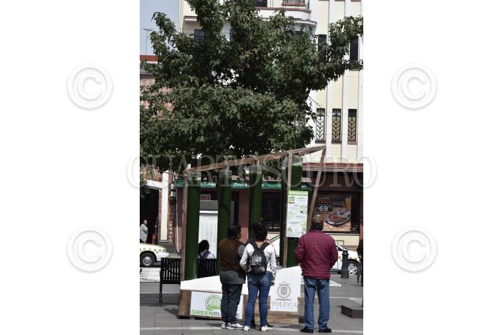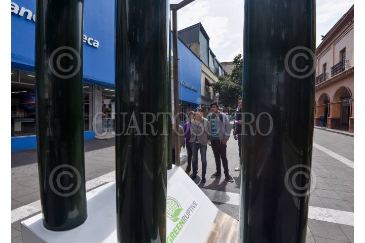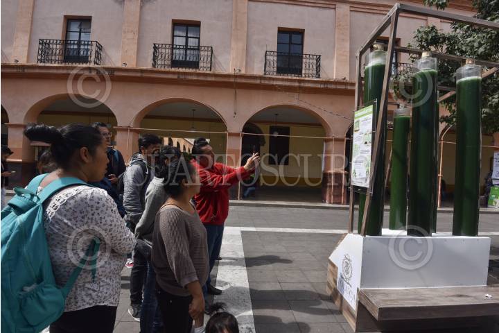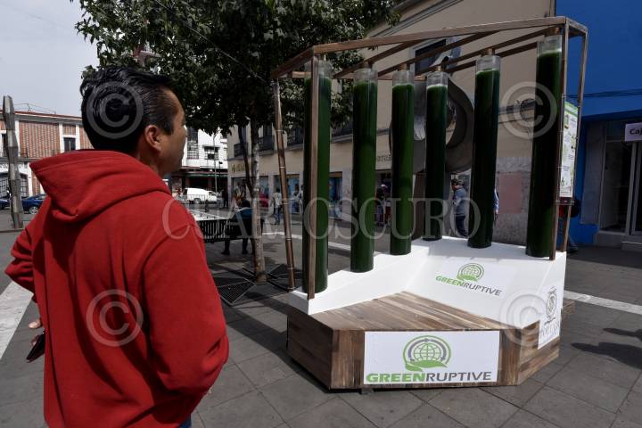 TOLUCA, ESTADO DE MÉXICO, 19NOVIEMBRE2019.- En el Andador Constitución de los Portales de Toluca fue instalado un Fotobiorreactor de microalgas, es una máquina que utiliza microbiología para eliminar gases y partículas contaminantes del aire que respiramos, y es capaz de producir el oxígeno equivalente de 50 árboles, solo se han instalado tres en el país y forma parte del programa piloto “Aprovechamiento Sustentable de Contaminantes Atmosféricos y Acuíferos”. FOTO: CRISANTA ESPINOSA AGUILAR /CUARTOSCURO.COM