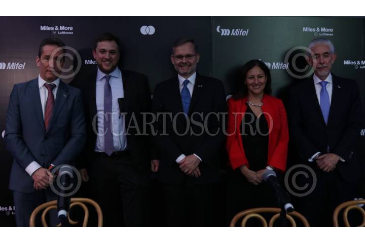 Daniel Becker Feldman, presidente de la Asociación de Bancos de México (ABM); Marc Linkenbach, Head of payment international Miles & More; Alejandro Arias, director general de ventas para México y Centroamérica Lufthansa; Analicia García, Vp Business Development Mastercard y Bulamro Guzmán, director general banca Mifel durante la presentación de lanzamiento de la nueva tarjeta especial para viajeros de Mifel.