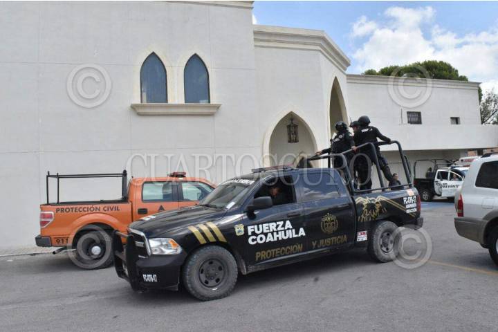 PIEDRAS NEGRAS, COAHUILA, 09JUNIO2018.- Policias estatales resguardan el lugar donde es velado el cuerpo de Fernando Purón, candidato del PRI a diputado federal, quien fue asesinado de un balazo en la cabeza la noche de ayer al salir de un debate en la Universidad Autónoma de Coahuila. FOTO: CUARTOSCURO.COM