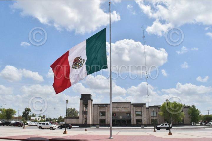 PIEDRAS NEGRAS, COAHUILA, 09JUNIO2018.- La bandera de la explanada municipal lució a media asta por el asesinato de Fernando Purón, candidato del PRI a diputado federal, quien recibió un balazo en la cabeza la noche de ayer al salir de un debate en la Universidad Autónoma de Coahuila. FOTO: CUARTOSCURO.COM