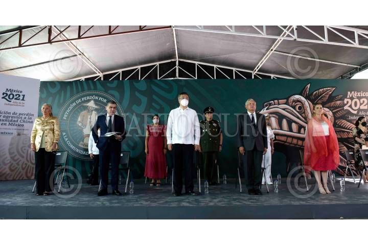 Olga Sánchez Cordero, Miguel Ángel Riquelme Solís, Zhu Qingqiao, Andrés Manuel López Obrador, y Beatriz Gutiérrez Müller, durante la ceremonia de "Petición de perdón por agravios a la comunidad china en México".
