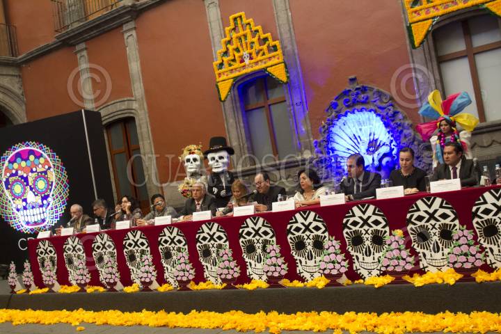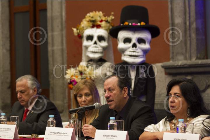 CIUDAD DE MÉXICO, 20OCTUBRE2016.- Miguel Ángel Torruco, secretario de Turismo; Lourdes Berho Corona, directora del consejo de promoción turística federal; Eduardo Vázquez Martín, secretario de cultura de la capital, y Betsabée Romero, artista plástica, dieron los detalles de las actividades que se celebrarán con motivo de la celebración del Día de Muertos. FOTO: MOISÉS PABLO /CUARTOSCURO.COM