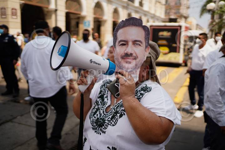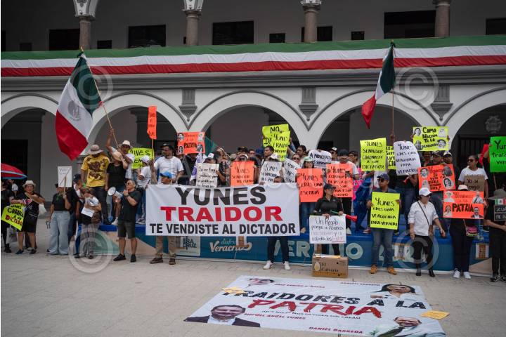 VERACRUZ, VERACRUZ, 11SEPTIEMBRE2024. Trabajadores del Poder Judicial de la Federación (PJF), en Veracruz, se manifestaron a las afueras del palacio municipal con pancartas y actos en contra del senador panista, Miguel Ángel Yunes Márquez, luego de que votara a favor de la reforma judicial propuesta por el presidente, Andrés Manuel López Obrador. Previo a la manifestación, todos los trabajadores del ayuntamiento así como la alcaldesa Patricia Lobeira, esposa de Yunes Márquez, desalojaron el inmueble que fue resguardado por elementos policiales. FOTO: VICTORIA RAZO/CUARTOSCURO.COM