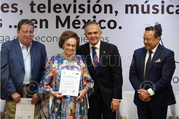 CIUDAD DE MÉXICO, 22FEBRERO2024. Julia Gama, Miguel Ángel Mancera y Marco de la O durante la entrega de reconocimientos por parte del grupo parlamentario del PRD a mexicanos triunfadores, en el Senado de la República. FOTO: EDGAR NEGRETE LIRA/CUARTOSCURO.COM