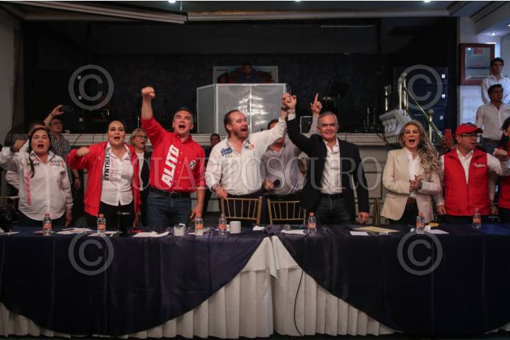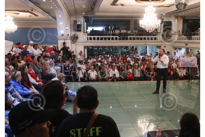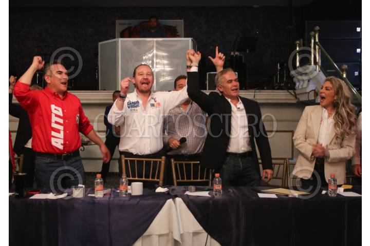 CIUDAD DE MÉXICO, 28ABRIL2024.- Santiago Taboada, candidato a la jefatura de gobierno por la coalición Va por México acompañado de Alejandro Moreno, presidente del PRI; Nora Arias Contreras, presidenta estatal del PRD; Miguel Ángel Mancera, candidato a la diputación durante Asamblea Nacional con la Confederación Nacional de Industriales de Metales y Recicladores (CONIMER). FOTO: ANDREA MURCIA /CUARTOSCURO.COM