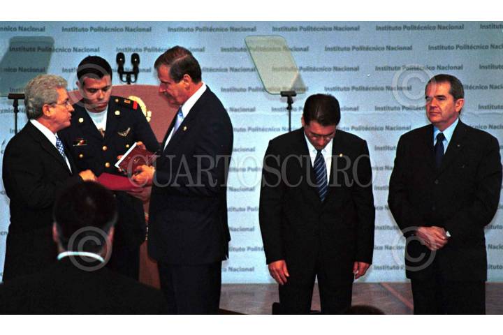 Vicente Fox, primer mandatario, Francisco Medellin Leal, oficial mayor de la secretaría de Educación Pública, y Migel Angel Correa Jasso, director general del IPN, durante la ceremonia de entrega de presea "Lazaro Cárdenas" e inauguración del año académico 2003-2004 del IPN, en la residencia presidencial. FOTO: Sandra Perdomo/CUARTOSCURO.COM