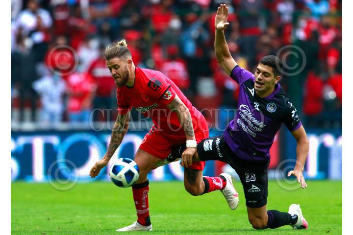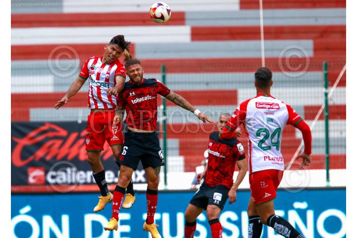 Miguel Barbieri defensa de los Diablos Rojos del Toluca y Martín Barragán delantero de los Rayos del Necaxa durante el encuentro en el Estadio Nemesio Diez.