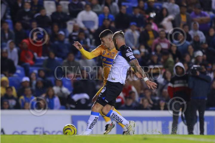 QUERÉTARO, QUERÉTARO, 29ENERO2024.- Juan Purata del Tigres y Miguel Barbieri del Queretaro, durante el juego entre Queretaro y Tigres de la jornada 3 del Torneo Clausura 2024 de la Liga MX, celebrado en el estadio Corregidora con marcador final de empate a uno. FOTO: CÉSAR GÓMEZ/CUARTOSCURO.COM