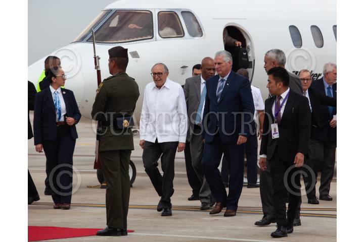 ZUMPANGO DE OCAMPO, ESTADO DE MÉXICO, 29SEPTIEMBRE2024.- -Miguel Díaz-Canel Bermúdez presidente de Cuba a su llegada al Aeropuerto Internacional Felipe Ángeles (AIFA) donde se espera que asista a la toma de protesta que se llevará a cabo el próximo primero de octubre. Fue recibido por David Kershenobich Stalnikowitz. FOTO: ANDREA MURCIA /CUARTOSCURO.COM
