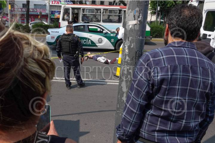CIUDAD DE MÉXICO 10JUNIO2025.-Personas que caminaban sobre Avenida Marina Nacional y pasajeros a bordo de un camión, direjen sus miradas al cuerpo de un hombre tirado en la carpeta asfáltica que murió luego de un aparente infarto en la alcaldía Miguel Hidalgo. FOTO:ROGELIO MORALES /CUARTOSCURO.COM