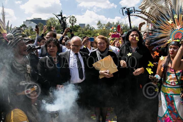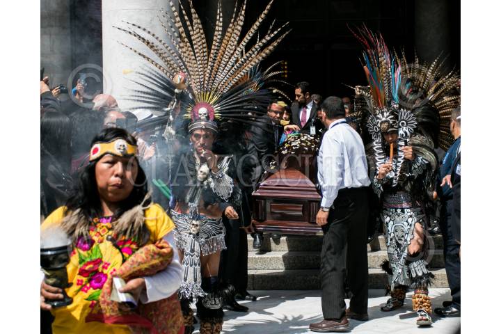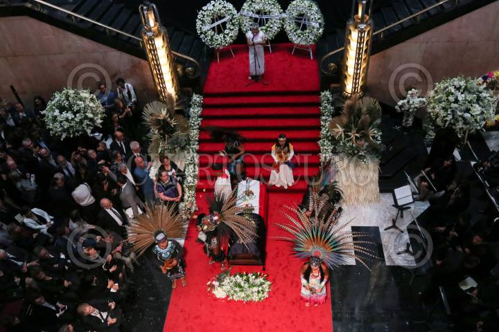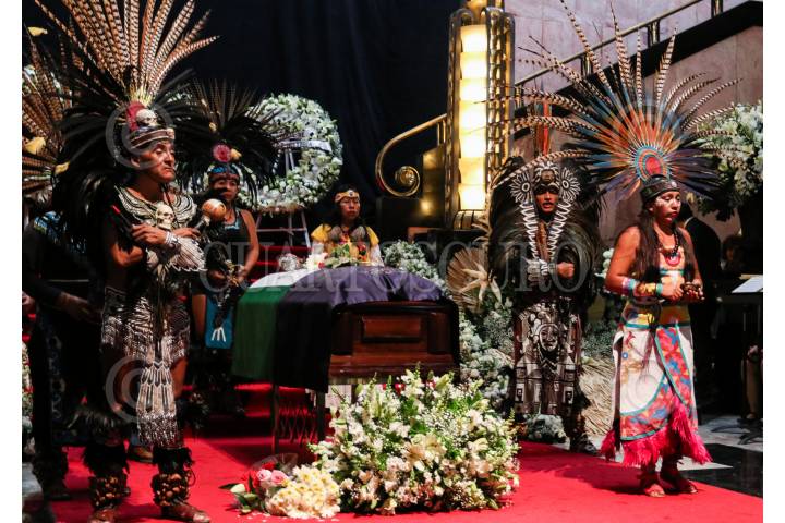 CIUDAD DE MÉXICO, 03OCTUBRE2019.- El primer historiador, filósofo, filólogo y lingüista del náhuatl Miguel Léon-Portilla, fallecido el pasado el pasado 01 de octubre, fue homenajeado en el Palacio de Bellas Artes. En la imagen, un grupo de danzantes prehispánicos realizaron una ceremonia y guardia de honor al académico. FOTO: GALO CAÑAS /CUARTOSCURO.COM