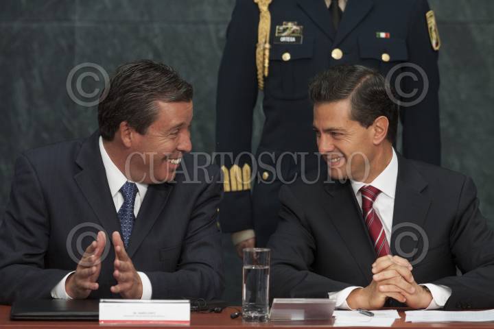 CIUDA DE MÉXICO, 17MAYO2017.- Eruviel Ávila Villegas, gobernador del Estado de México; Omar Fayad, gobernado de Hidalgo; Miguel Márquez Márquez, gobernador de Guanajuato; Rafael Alejandro Moreno Cárdenas, gobernador de Campeche; Francisco Guzmán Ocho, jefe de la oficina de la Presidencia de la República; Raúl Cervantes Andrade, procurador general de la República, y Miguel Ángel Osorio Chong, secretario de Gobernación, guardaron un minuto de silencio por el asesinato del periodista Javier Valdez durante la reunión convocada por el presidente Enrique Peña Nieto en torno a las acciones para la protección a periodistas y la libertad de expresión. FOTO: GALO CAÑAS /CUARTOSCURO.COM