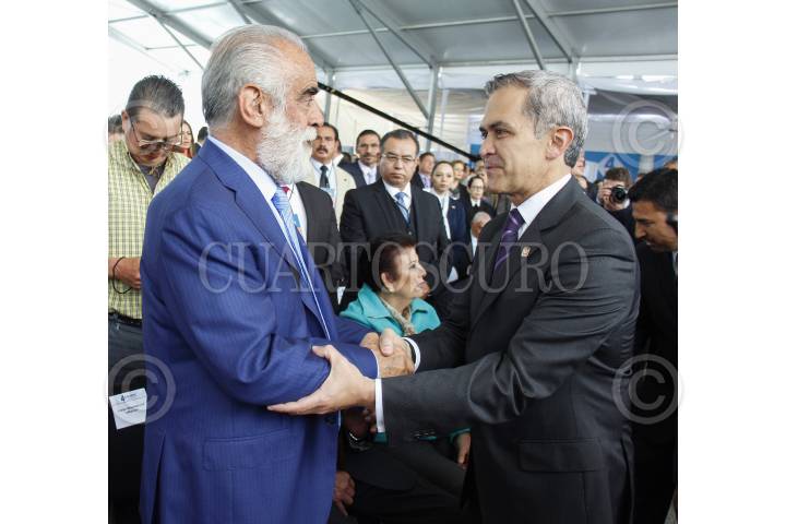 SILAO, GUANAJUATO, 03MARZO2016.- Diego Fernández de Ceballos saluda a Miguel Ángel Mancera, jefe de gobierno de la Ciudad de México, durante el cuarto informe del gobernador Miguel Márquez Márquez en el parque bicentenario. FOTO: GUSTAVO BECERRA /CUARTOSCURO.COM