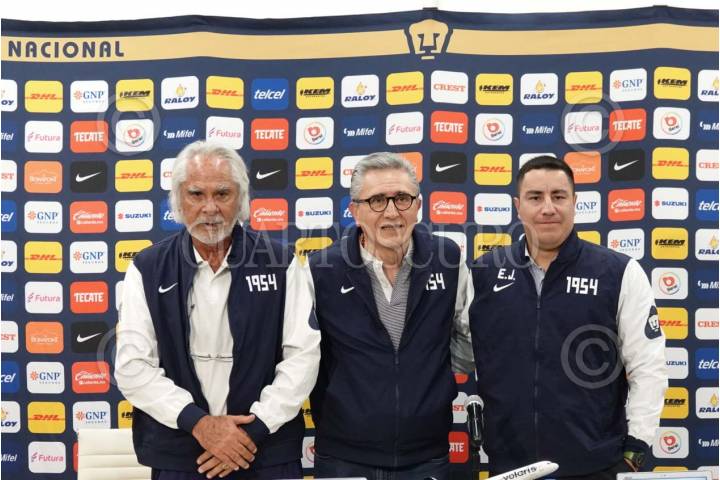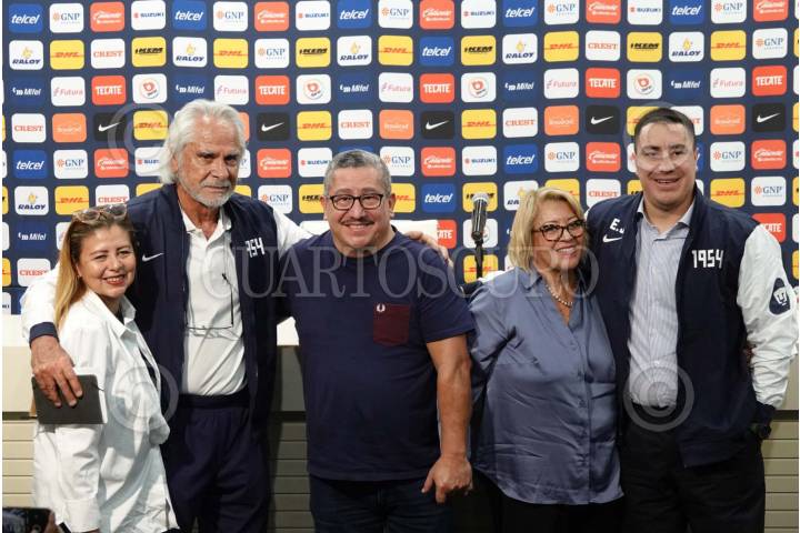 CIUDAD DE MÉXICO, 15AGOSTO2025.- Miguel Mejía Barón, vicepresidente deportivo del Club Universidad Nacional; Luis Raúl González, presidente del Club Universidad Nacional, y Leonardo Cuéllar, coordinador de Desarrollo del Futbol Femenil Club Universidad Nacional; durante la presentación oficial de Liced Serna, mediocampista de Pumas; y Ariadna Dorantes, delantera de Pumas, como nuevos refuerzos del plantel FOTO: MARIO JASSO/CUARTOSCURO.COM
