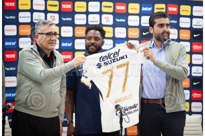 CIUDAD DE MÉXICO, 16JULIO2025.- Álvaro Ángulo, nuevo jugador de Pumas, acompañado de Miguel Mejía Barón, vicepresidente del club Universidad; Luis Raúl González Pérez, presidente club UNAM y Eduardo Saracho Sánchez, director de estrategia deportiva Club UNAM, encabezaron conferencia de prensa. FOTO: ANDREA MURCIA /CUARTOSCURO.COM