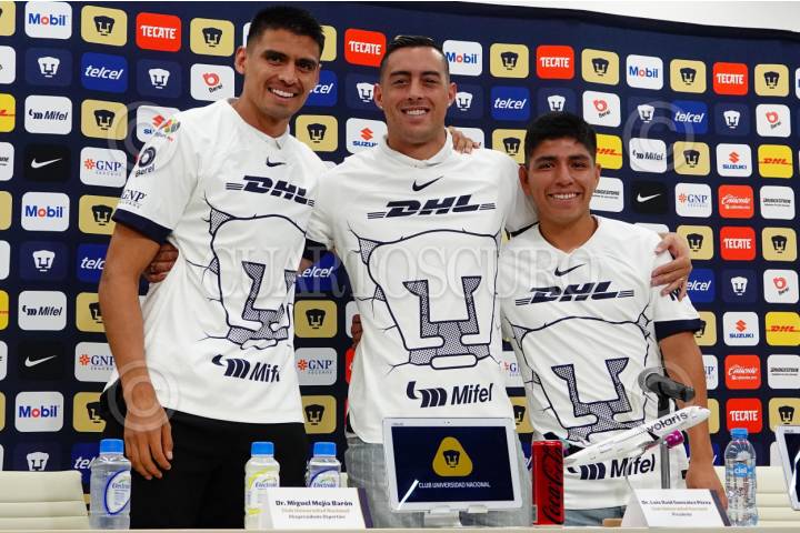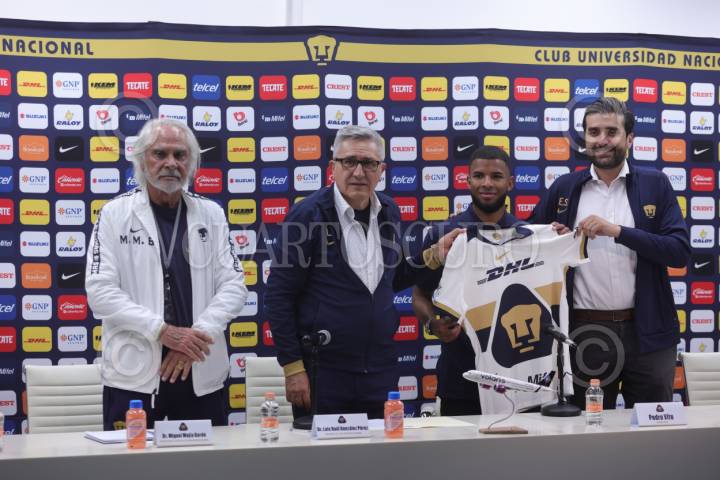 CIUDAD DE MÉXICO, 18JULIO2025. Miguel Mejía Barón, vicepresidente deportivo; Luis Raúl González Pérez, presidente del Club Universidad y Eduardo Saracho Sánchez, director de estrategia deportiva presenta al jugador ecuatoriano Pedro Vite como nuevo refuerzo del Club Universidad Nacional, en instalaciones de La Cantera. FOTO: EDGAR NEGRETE LIRA/CUARTOSCURO.COM