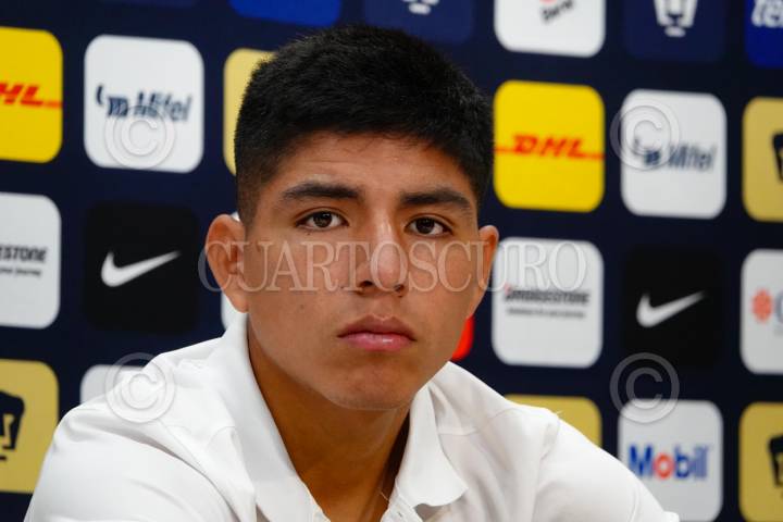CIUDAD DE MÉXICO, 10ENERO2024.- Piero Quispe, mediocampista, durante la presentación de los nuevos jugadores de los Pumas de la Universidad en la Cantera. FOTOS: ROGELIO MORALES /CUARTOSCURO.COM
