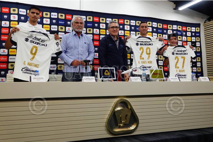 CIUDAD DE MÉXICO, 10ENERO2024.- Guillermo Martínez, delantero, Miguel Mejia Barón, vicepresidente deportivo, Luis Raúl Gonzáles, presidente deportivo, Rogelio Funes Morí, delantero, Piero Quispe, mediocampista, durante la presentación de los nuevos jugadores de los Pumas de la Universidad en la Cantera. FOTOS: ROGELIO MORALES /CUARTOSCURO.COM