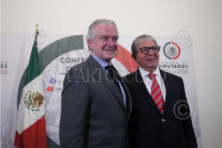 Santiago Creel, presidente de la mesa directiva de la Cámara de Diputados, y el periodista Miguel Reyes Razo se tomaron una foto durante una conferencia en la Cámara de Diputados