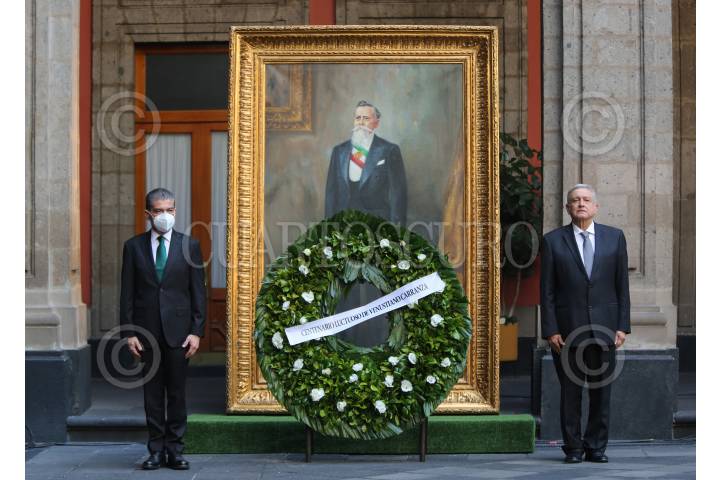 Miguel Riquelme, gobernador de Coahuila, y Andrés Manuel López Obrador, Presidente de México, montan una guardia de honor junto a una pintura del ex Presidente Venustiano Carranza