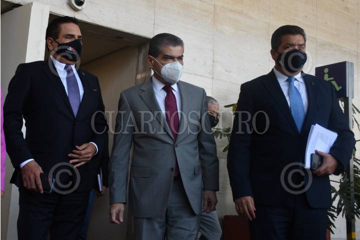 Silvano Aureoles, gobernador de Michoacán, Miguel Riquelme, gobernador de Coahuila y Francisco Javier Cabeza de Vaca, gobernador de Tamaulipas, a su llegada a la reunión con Diputados. En la imagen, Riquelme saluda a Ignacio Mier, nuevo coordinador de Morena en Diputados.